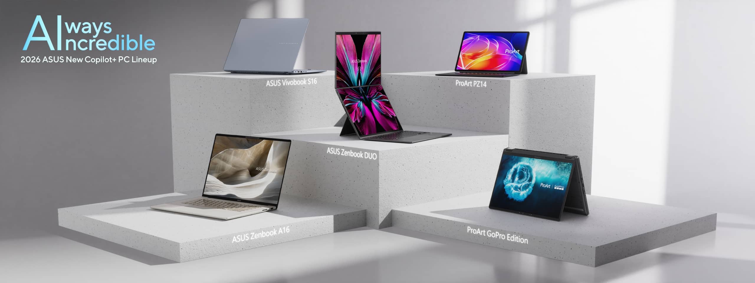 A linha ProArt inclui o ProArt GoPro Edition, desenvolvido em parceria com a GoPro. Este modelo conversível de 13 polegadas oferece acesso ao GoPro Cloud e recursos de edição assistidos por IA. Já o ProArt PX13 tradicional foca na execução local de modelos de IA, enquanto o ProArt PZ14 é um tablet com teclado destacável.