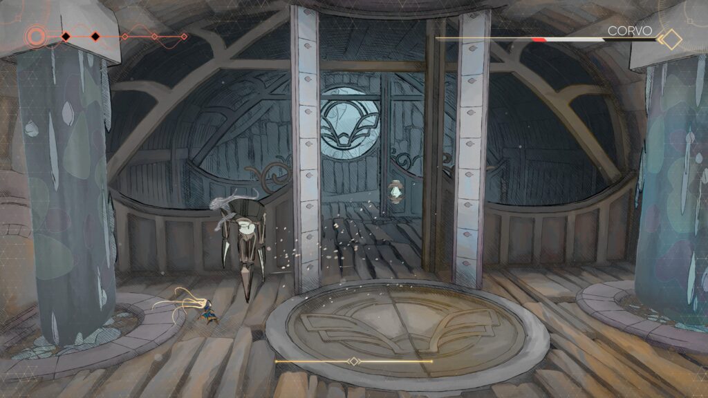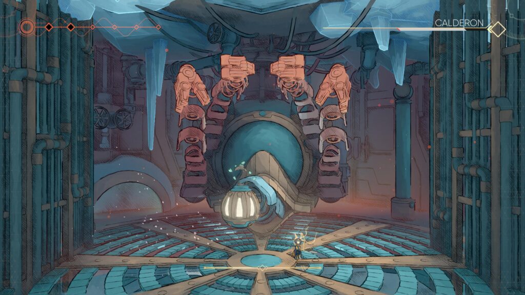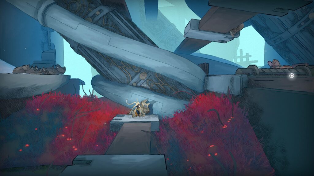 Trata-se de um jogo 2D de plataforma no estilo Metroidvania, em que a progressão do personagem libera novas áreas e caminhos dentro de uma enorme nave. O que chama atenção é a variedade desses espaços. Cada região da Nau funciona como um bioma próprio, com identidade visual bem definida. Há áreas onde a flora tomou conta das estruturas metálicas, misturando natureza e tecnologia, enquanto outras mostram sinais claros de degradação: partes caídas, ambientes destruídos e uma espécie de infecção que parece se espalhar pela nave, transformando tudo ao redor.