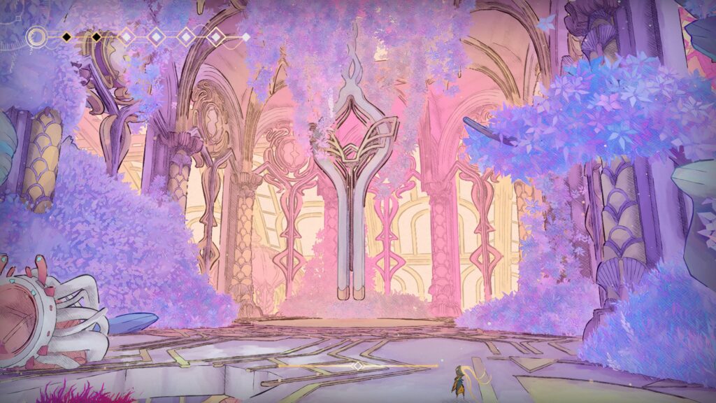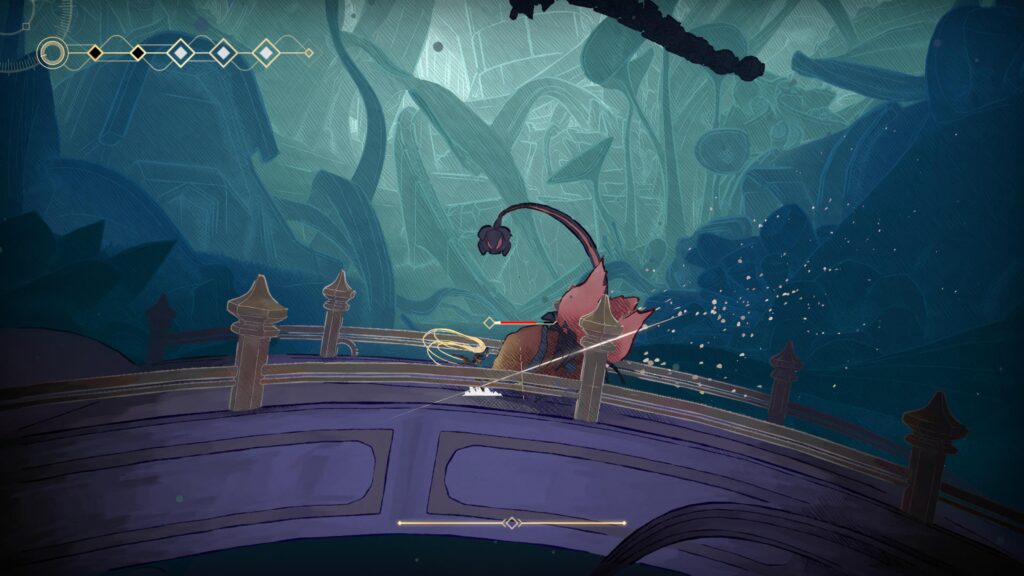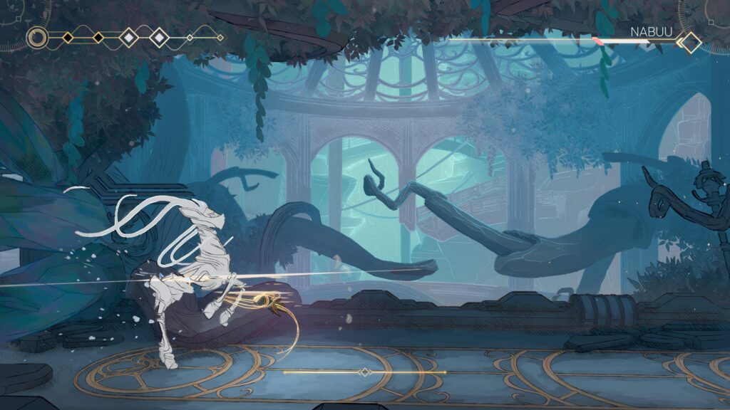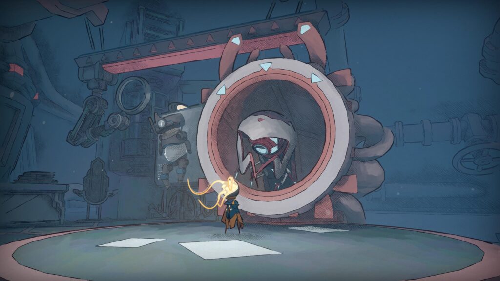 O primeiro grande diferencial de Mio: Memories in Orbit está justamente nesse foco em desafios de plataforma mais exigentes. Em vários momentos, não basta apenas ter a habilidade certa: é preciso dominar o ritmo, errar, tentar de novo e repetir o processo até conseguir superar trechos particularmente complexos. Há sequências que exigem execução quase perfeita, lembrando em alguns momentos jogos como Hollow Knight no sentido de precisão, leitura e memorização dos movimentos. É um jogo que cobra bastante do jogador em diversos pontos da campanha.