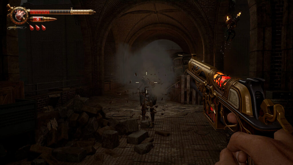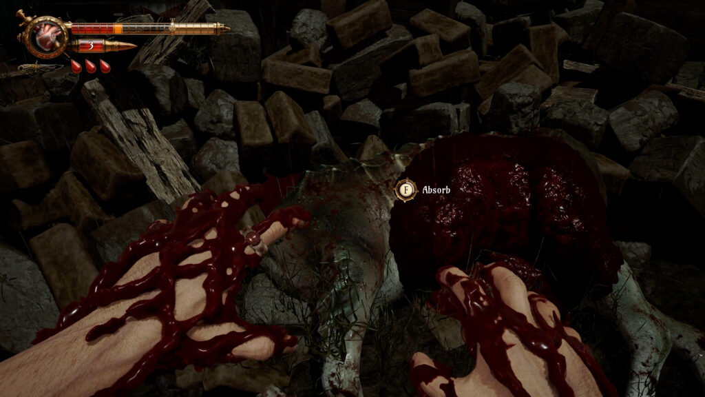 Armas mais poderosas, como a escopeta, drenam muito mais sangue ao serem recarregadas, enquanto opções mais simples exigem um custo menor. O jogador precisa avaliar constantemente se vale a pena entrar em confronto, procurar mais sangue pelo cenário ou até mesmo recuar.