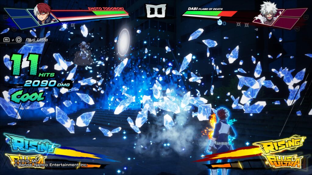 A dinâmica brilha no sistema de trios. A movimentação é fluida e permite alternar entre personagens no meio de combos, convocar assistências ou encadear até três Plus Ultras devastadores. O único ponto negativo no balanceamento é a vantagem desproporcional de personagens de longo alcance contra lutadores corpo a corpo, algo que se torna frustrante contra chefes como Tomura no modo história.