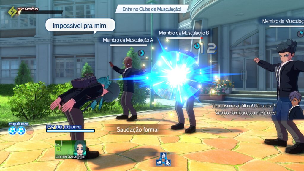 Fora dos gramados, o Modo História introduz as Batalhas de Foco. São combates de RPG por turnos baseados em “Pedra, Papel e Tesoura”, usados para recrutar alunos ou resolver conflitos. Você deve observar a intenção do oponente e escolher a ação com vantagem. Ao carregar sua barra, é possível liberar um ataque especial em área. É um sistema que adiciona variedade e funciona surpreendentemente bem, mantendo o desafio mesmo sem a bola nos pés.