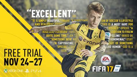 Hoje a Electronic Arts Inc. anunciou que os jogadores de Xbox One e PlayStation 4 podem aproveitar o aclamado EA SPORTS FIFA 17 de graça neste fim de semana. Das 16h (horário de Brasília) de quinta feira, dia 24 de novembro, até 6h do dia 28 de novembro, os fãs podem experimentar o jogo que que a Revista PlayStation chamou de “um novo patamar para a série”. Todos os modos de jogo estarão disponíveis para os fãs aproveitarem, incluindo o novo modo história: A Jornada. Os jogadores terão a oportunidade de viver a história de Alex Hunter na Premier League, dentro e fora de campo. Com apenas um mês de carreira profissional, Hunter já causou um impacto mundial, com jogadores de 183 países iniciando sua Jornada.