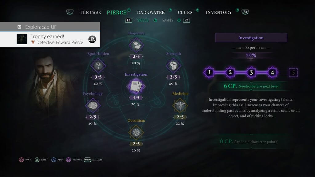 Mas mesmo com esses dois problemas eu tava decidido a seguir na minha saga em nome de Cthulhu, e tomar essa decisão foi uma coisa maravilhosa a se fazer. Me envolvi no jogo em níveis bem próximos aos que eu me envolvo com livros, as decisões realmente tem influencia nos rumos da história e há uma mecânica de “ficha de personagem” que torna tudo ainda mais profundo, pois o acesso a novas opções e os acessos a novos conteúdos são baseados também nas características que você decide evoluir, sendo que 2 em específico, Ocultismo e Medicina, só podem ser evoluídas com pontos de personagem na criação de personagem, o que ocorre nos 10 minutos iniciais do game. Após esta decisão inicial, estes dois só podem ser evoluídos encontrando arquivos durante a história, em sua maioria livros, de medicina e de ocultismo.