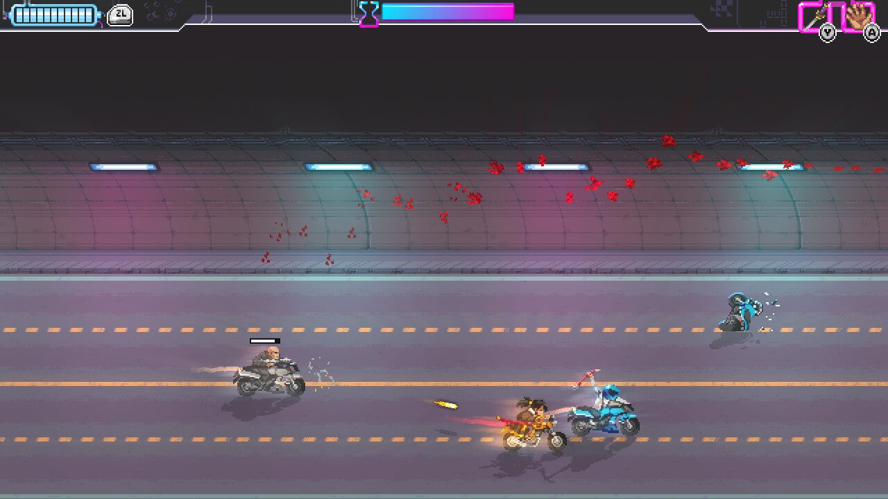 Por fim tenho que aplaudir o belo trabalho feito em cima do visual do jogo e em sua trilha sonora. Feito através do pixle art, ele tem uma temática neo-noir que combina um mundo com visual futurista e com elementos da década de 90. Não somente ele apresenta diversos belos visuais, mas também é muito interessante o decorrer das fases. O exemplo mais claro é o rastro de sangue no chão e na parede após matar os inimigos (nunca disse que era um jogo de família).