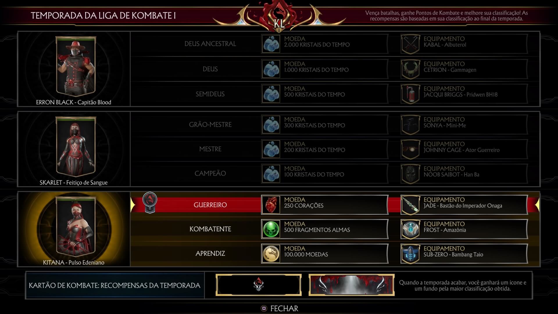 Como falamos, as recompensas são variadas. Ao final de cada etapa do ranking você ganha um equipamento. Chegando ao ranking Campeão, você desbloqueia a primeira skin exclusiva, que é da Kitana (Pulso Edeniano). Quando atingir o nível Semi Deus você libera a da Skarlet (Feitiço de Sangue). Terminando o ranking Deus Ancestral você ganha a skin Capitão Blood, de Erron Black.