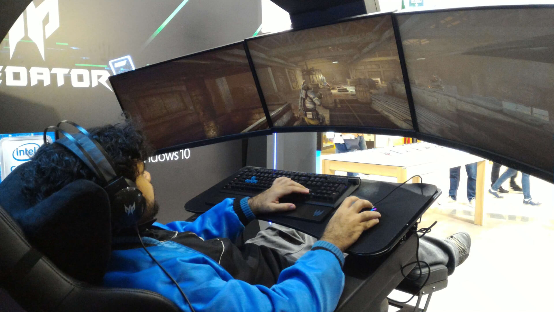 O suporte acima da cabeça oferece visão panorâmica com três monitores curvos Predator Z271U WQHD de 27 polegadas, que têm tecnologia NVIDIA® G-SYNC® e uma taxa de atualização nativa de 144 Hz, feitos exclusivamente para a máquina.