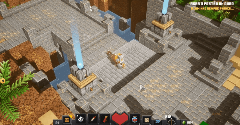 Diferente de outros jogos do gênero, a curva de aprendizado do Minecraft Dungeons é rápida. E o jogo te ajuda ao mesmo tempo. Por exemplo, ao pegar um item dropado, no canto da tela aparece uma setinha indicando se ele possuí nível mais forte ou mais fraco do que o já equipado em seu personagem. Isso elimina aquele tempo desnecessário (depende do ponto de vista) no qual o jogador precisa abrir o inventário inúmeras vezes, ler inúmeros textos e fazer comparativos para decidir qual equipamento usar.