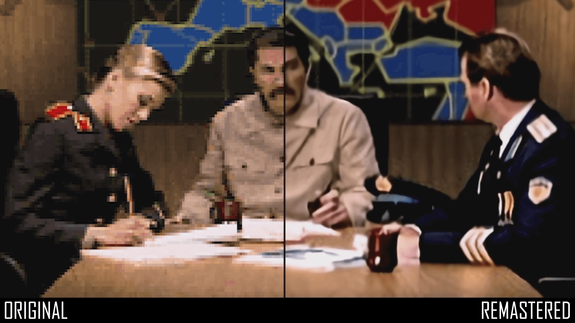 Outra melhoria é que as cenas que mencionei onde atuavam pessoas pessoas, também receberam melhorias. Logicamente elas não foram refeitas, mas receberam um tratamento. Algumas cenas impressionam com a melhoria, em especial a Tiberium Dawn, enquanto as cenas do Red Alert ficaram menos visíveis as melhoras.