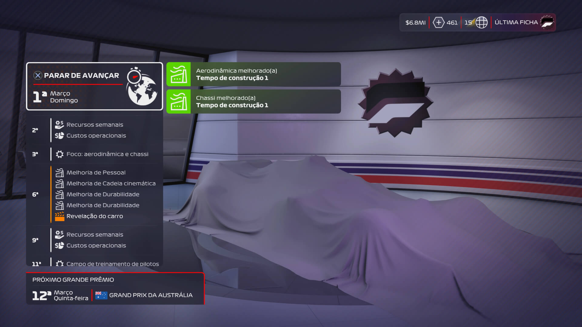 Algo que também se manteve foi o desenvolvimento do carro no modo carreira. Além de ser válido investir no desenvolvimento do carro, no fim de cada temporada novas regras surgirão e você deverá correr que nem um louco para não perder as evoluções já feitas.