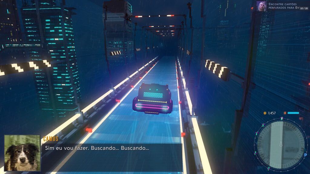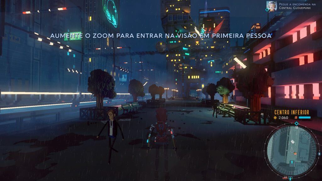 O gameplay de Cloudpunk é bastante funcional onde você praticamente tem que dirigir o seu HOVA de um ponto para outro, sair do veículo e ir realizar a entrega a pé.