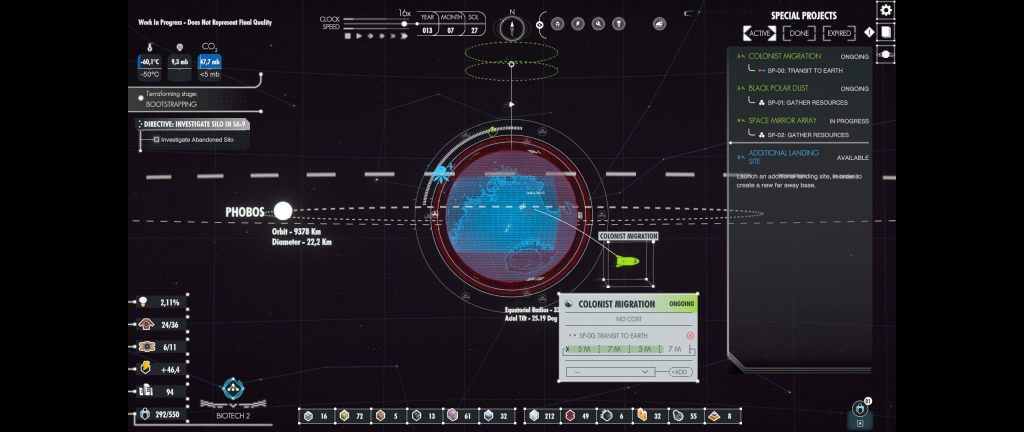 Além disso, você receberá a possibilidade de fazer inúmeros projetos faraônicos. Por exemplo, será possível construir uma série de espelhos para refletir a luz do sol nas calotas polares. Será possível construir uma estação espacial que permitirá fazer outras bases principais sem estar interligada na sua base inicial e por ai vai.