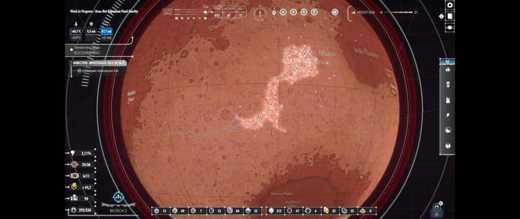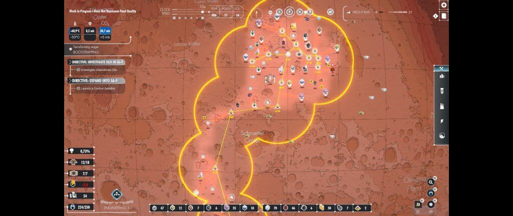 A idea em Per Aspera é muito simples. Você deverá terraplanar Marte para receber e abrigar a vida humana. Caso você já tenha jogado o jogo de tabuleiro Terraforming Mars, já sabe um pouco que irá encontrar.
