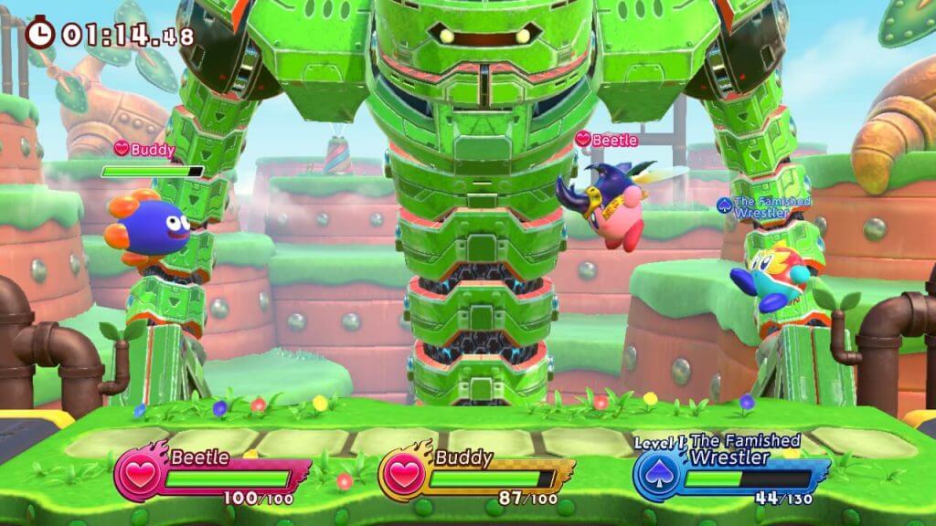 A diversão do game se encontra principalmente em jogar com os amigos. O jogo inicia com alguns poderes desbloqueado, e conforme os jogadores aumentam seus níveis, são liberadas diversas variações do Kirby, cada uma inspirada em um poder diferente proveniente de um dos jogos da franquia. As mecânicas de combate são bastante intuitivas, com um botão servindo para atacar e outro para pular. No entanto, o ataque varia conforme a direção que o jogador estiver segurando. Por conta disso, a variedade de estilos de luta que o jogo apresenta é bastante extensa e a experiência se torna muito divertida quando jogada em doses pequenas e com amigos.