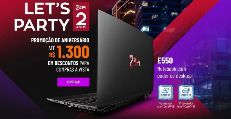 O notebook 2 A.M. E550, principal produto com desconto no aniversário da empresa, tem processador de desktop e se destaca pela versatilidade, tanto para jogar quanto para trabalhar. Além de todos estes e outros benefícios do laptop de alta performance, até o fim de outubro, os consumidores podem aproveitar a promoção que dá descontos de até R$1.300 em oito versões do E550. A oferta faz parte das comemorações da 2 A.M. pelo segundo ano de operação, é válida para compras à vista e está disponível pelo site oficial da marca .