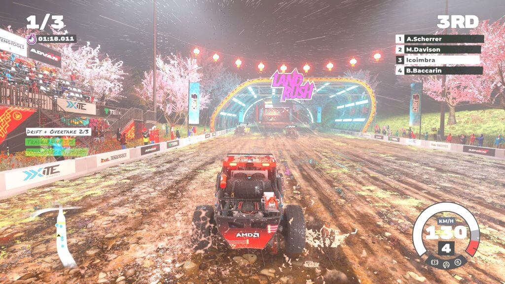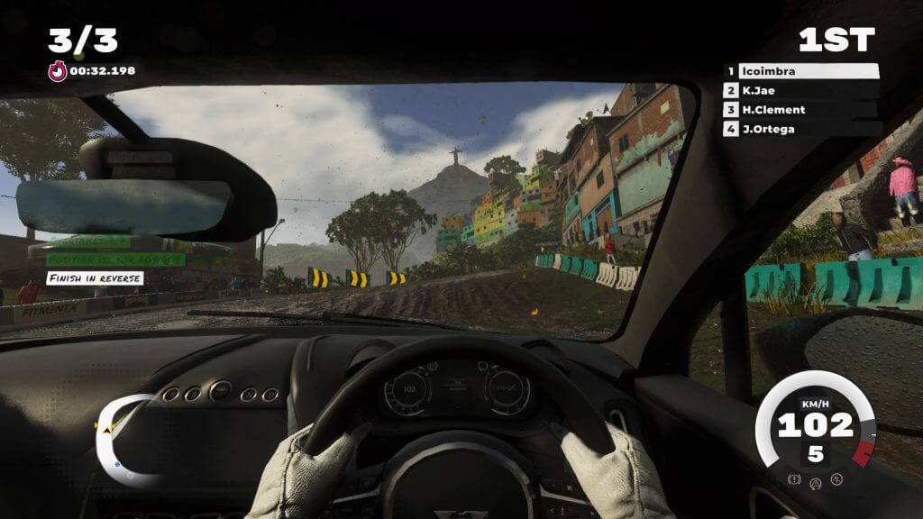 De cara posso dizer que Dirt 5 é lindo. A cada nova pista me impressionava com a ambientação do jogo. O mais legal é que muitas pistas (muitas mesmo) mudam drasticamente ao longo da corrida. Pistas de manhã viravam noite e ficava mais difícil de enxergar. Em pistas no deserto chegava uma tempestade de areia. Já em pistas no gelo você sofria uma tempestade de neve. E por falar em tempestade, é muito comum ver tempestades mudando a cara dos circuitos incluindo a pista do Rio de Janeiro.