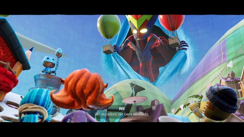 Algo que me impressionou no primeiro momento é a história. Diferente dos jogos de Little Big Planet que suas histórias são bem rasas e procurando apenas dar uma “justificativa” para o jogo acontecer, aqui temos algo mais bem construído com a introdução de um temível vilão chamado Vex, que escraviza todos os amigos do Sackboy e o deixa por último por tê-lo achado fofo.