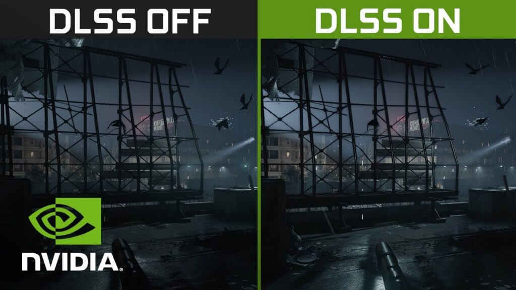 O segundo vídeo é dividido em duas telas, com DLSS ativado e desativado. A parte interessante do comparativo está nos cantos superiores direitos: o contador de FPS. Apesar de ser difícil de distinguir a qualidade das duas imagens, o contador de quadros com DLSS ativado tem cerca de o dobro comparado ao lado com DLSS desativado.