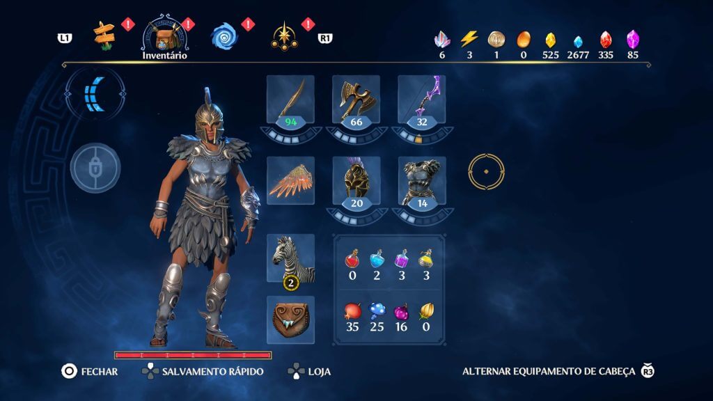 Anteriormente, eu mencionei os inúmeros desafios e a vasta exploração do jogo. A cada nova conquista você poderá conseguir uma ambrosia, raio de Zeus, moedas de caronte, novo equipamento e novas armas. Assim como ao matar os inúmeros tipos de inimigos, será possível adquirir diferentes tipos de “pedras mágicas”.