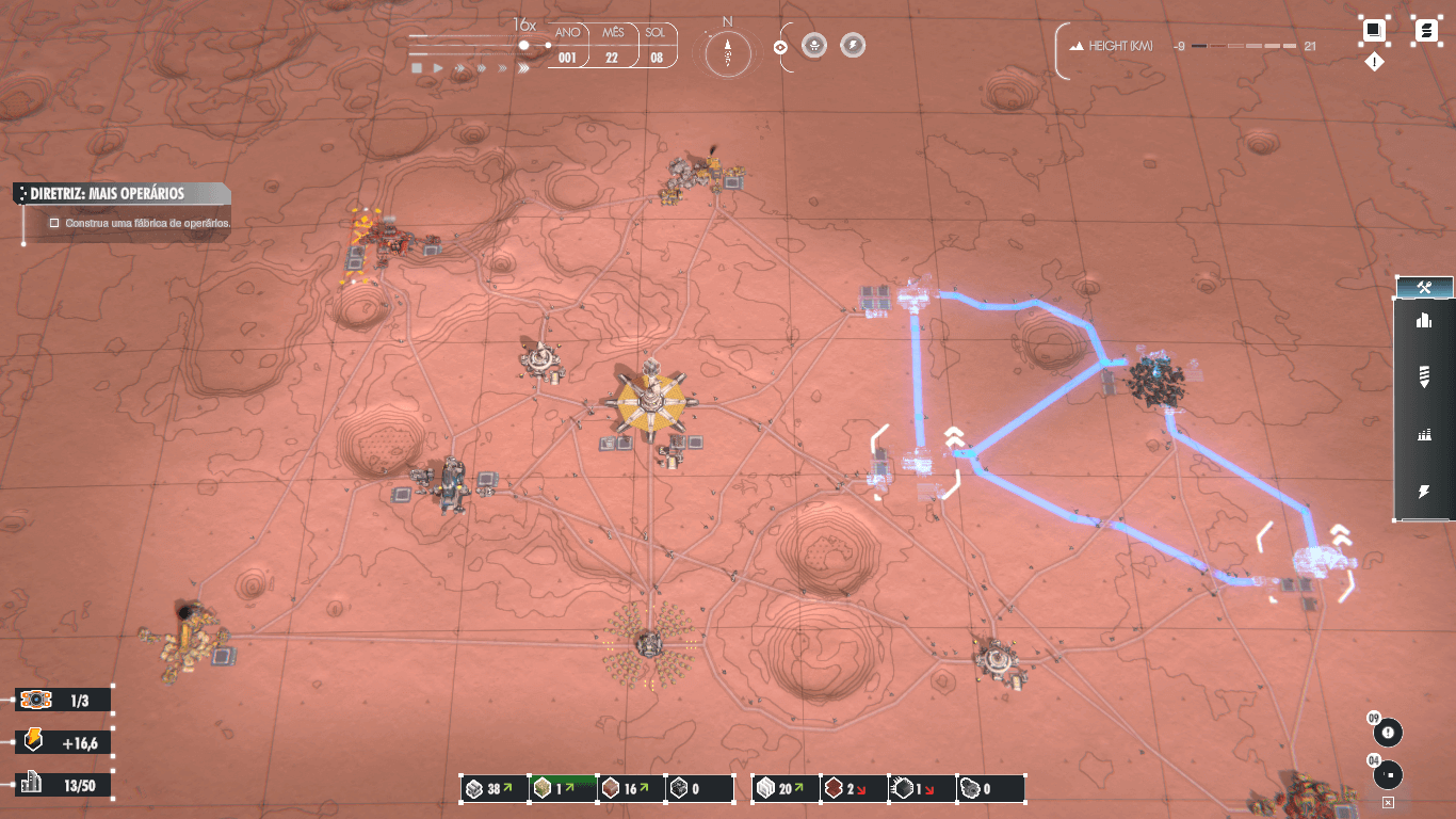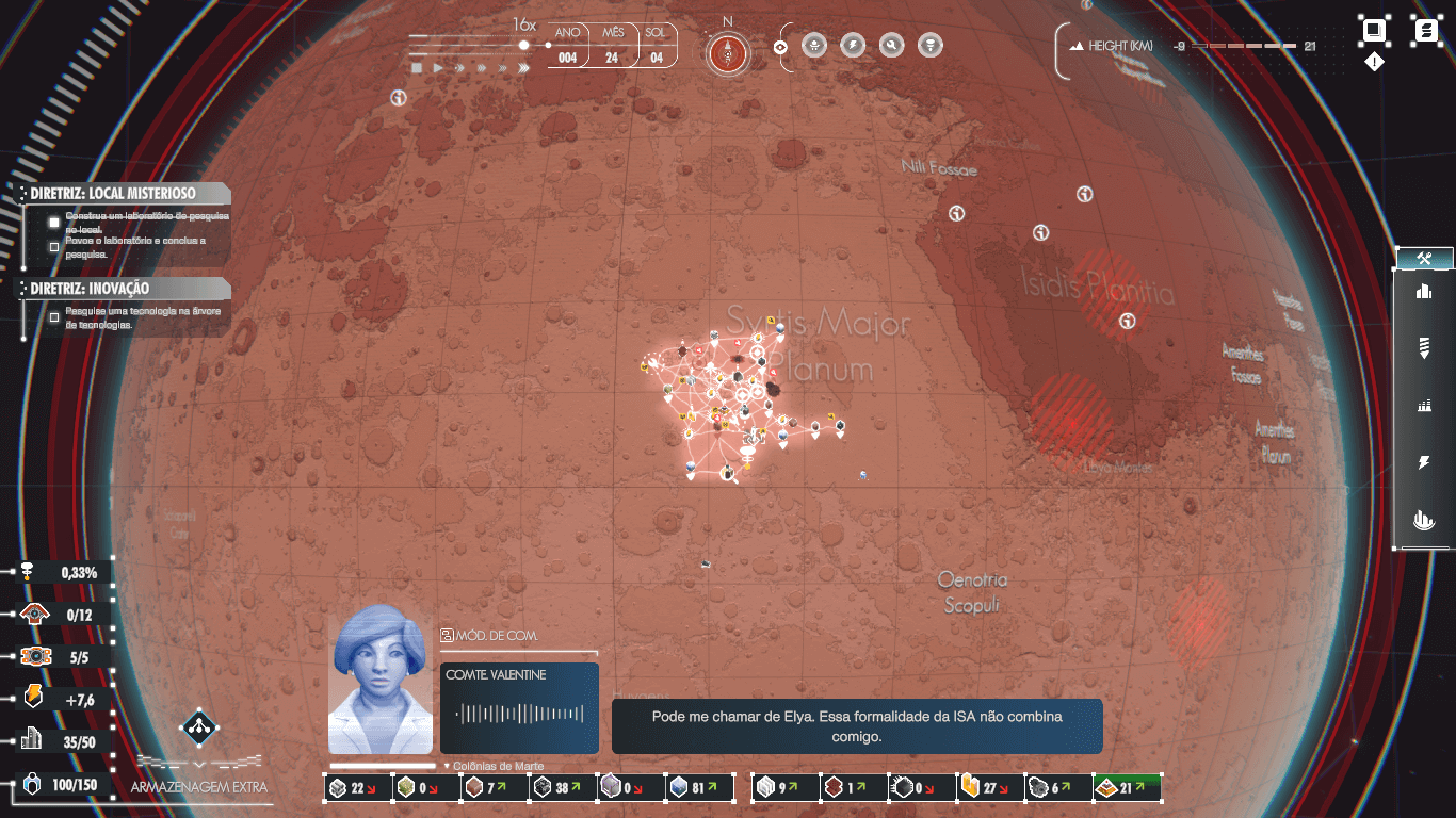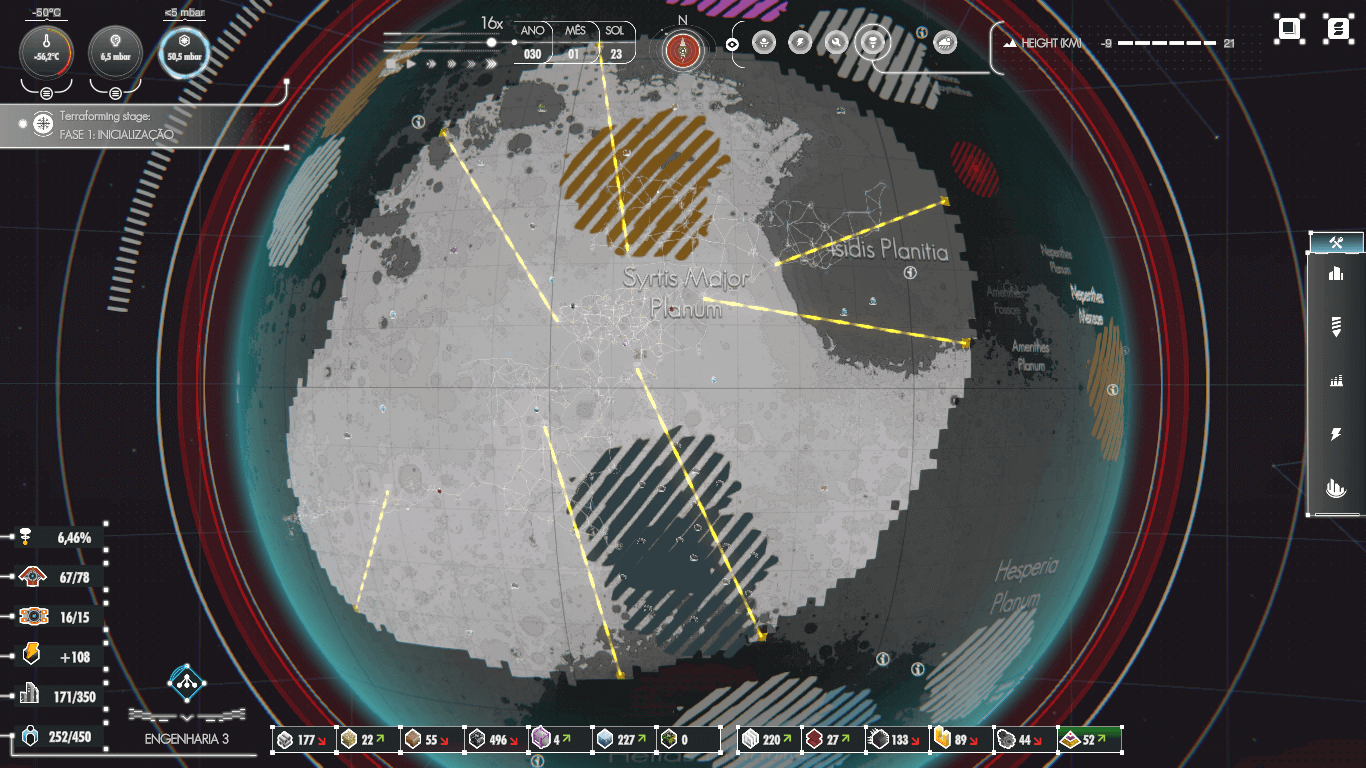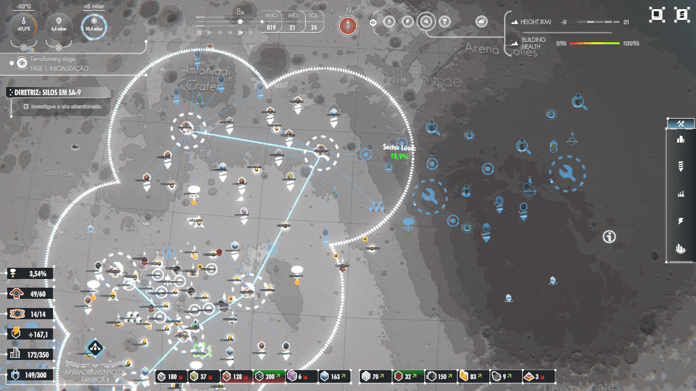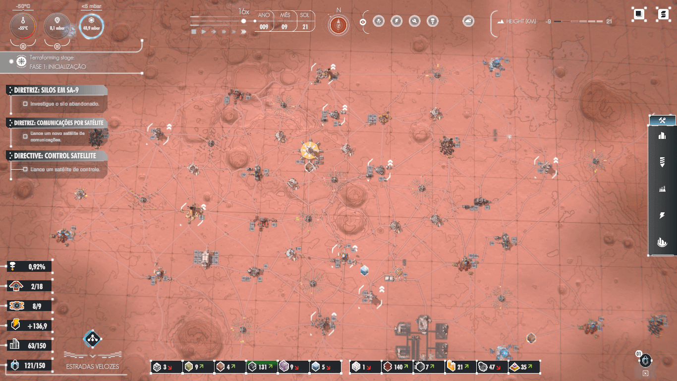 Depois de desenvolver os pilares de sua base espacial, são disponibilizadas ferramentas que liberam novas regiões do planeta, assim como recursos que facilitam a chegada de cientistas e outros tripulantes à órbita marciana. Estes humanos então passam a trabalhar em melhorias espaciais para que a base possa ser aprimorada. Assim, pode-se desenvolver desde estradas mais rápidas a novos recursos como Plutônio e até a melhoria da produtividade das minas e fábricas. Conjunto a isso existem perigos do ambiente hostil de Marte, contendo meteoros, tempestades de areia e os desgastes de estruturas causados pelo clima.