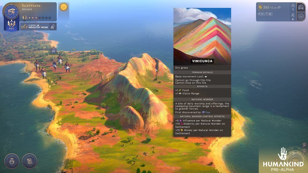Sobre a interface do jogo, o que posso dizer é que ela está bastante fluida e funcional. Certamente no que concerne à navegação, a tela de Humankind é mais limpa e organizada. Falta ainda uma enciclopédia do jogo e alguns atalhos dos quais o fã de Civ pode sentir falta, como por exemplo para troca de tropas. Apesar de eu haver configurado, estes nem sempre funcionavam, mas considerando ser apenas um cenário teste é aguardar Abril para ver o que fazem em relação a estes e outros bugs/otimização. Quanto a enciclopédia, diz-se estar confirmada para a versão completa do jogo.
