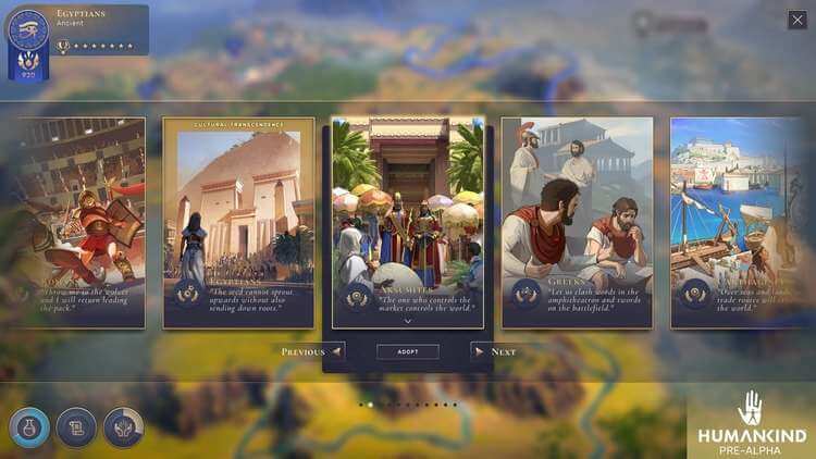 O termo opções de cultura entra aqui no lugar de civilização e não é a toa. Pense em Civilization e Humankind como uma peça de teatro ou um filme e em nós, jogadores, como atores desta grande produção. Enquanto em Civilization a escolha da civilização é como a escolha do papel a ser representado na peça ou no filme, em Humankind a escolha da cultura, que será feita novamente a cada passagem de Era, poderia ser pensada como a troca de figurino em uma peça de teatro. Umas vezes esta troca representa apenas uma mudança de roupa, como por exemplo ao mudar-se dos Hitties para os Romanos – duas culturas guerreiras – e noutras uma mudança na própria personagem representada pelo ator, por exemplo se você passar dos Romanos para os Ingleses – uma cultura militarista para uma agrária.