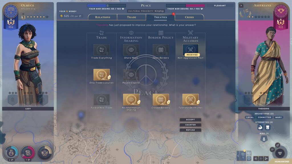De igual maneira, a diplomacia e as trocas comerciais são gerenciadas conforme este sistema de atitudes de uma nação para a outra. A diferença entre assustado e amigável pode estar entre o poder das suas tropas e a quantidade de demandas que você decide fazer aos outros líderes. E sem uma boa relação todos os acordos ficam impedidos.