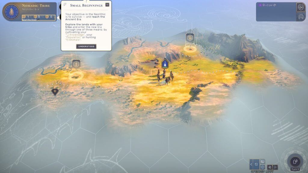 No título da Amplitude o jogador começa o mapa – ao menos neste teste que se chamou Lucy OpenDev – com um exército qualquer na Era Neolítica. Nesta Era ainda não está determinado quase nada sobre sua civilização a não ser o local de nascimento. Nas rodadas que envolvem os desdobramentos desta Era – normalmente umas 10 a 15 – o jogador deverá explorar, caçar e invadir santuários para que sua tribo possa crescer de tamanho ou sabedoria e assim alcançar uma nova Era.