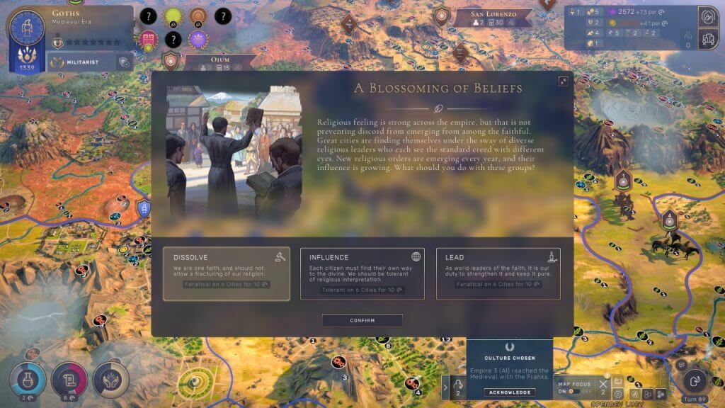 Já no que concerne à Religião preciso dizer que este talvez tenha sido um dos aspectos que menos explorei. À princípio, embora a roupagem tenha sido diferente daquela dada à interface religiosa no Civ, em Humankind também vemos as doutrinas espalharem-se por proximidade ou guerra teológica. Também igualmente funciona aqui um sistema de crenças. A confirmar fica a possibilidade de comprar infraestruturas e tropas com fé.