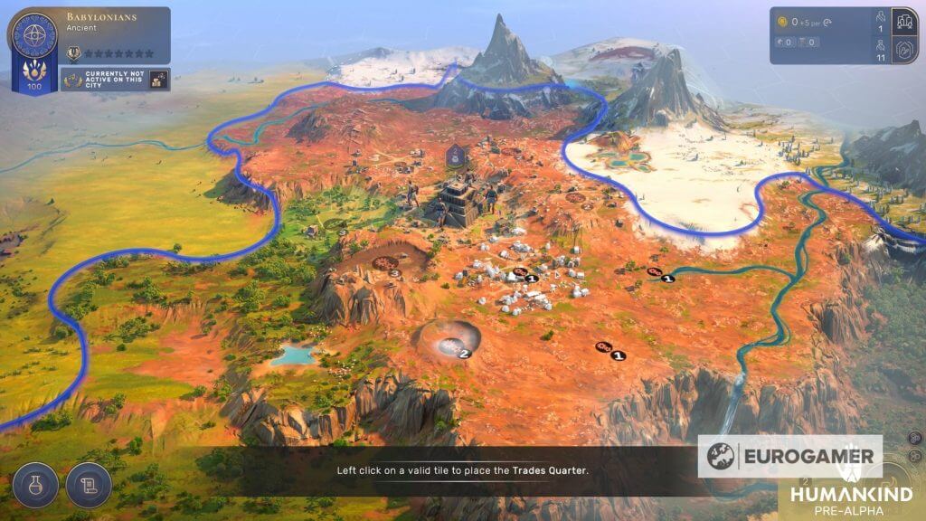 Já em Humankind a territorialidade funciona com um pouquinho mais de pimenta. Uma vez que você constrói um posto avançado está pré conquistado um território inteiro que normalmente tem uma boa extensão em tiles (ou hexágonos). Como cada hexágono é um espaço de construção ou movimentação, fica claro que com muitos postos avançados ou cidades uma boa parte do mapa pode ser facilmente dominado. Isso, é claro, se fosse simples manter muitas cidades estáveis ao mesmo tempo.