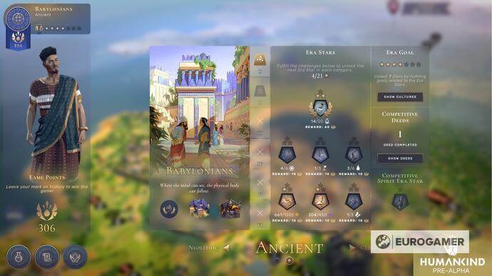 Todavia, não apenas a Amplitude não se furtou a fazer apostas e mudanças em cada um desses eixos clássicos do gênero como também ousou no próprio ponto de partida do jogo. Enquanto em títulos como Civilization VI você deve escolher uma cultura para iniciar o jogo e ir com ela até o final, numa tentativa de reproduzir ou melhorar os eventos da história daquela civilização, explorando vantagens que normalmente seguem do início ao fim àquilo que reflete com moderada fidelidade o que se viu na história real, em Humankind o que temos é um conceito que se não é completamente diferente, teve seu sentido alterado de maneira bem significativa.