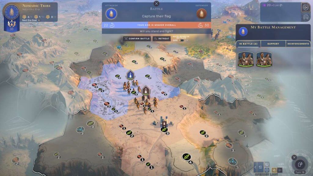Para atender aos mais belicistas dentre nós, a Amplitude implementou o que talvez seja a maior diferença de Humankind para com Civilization VI: um sistema de batalhas bem mais robusto e detalhado e no qual a geografia e o relevo do mapa são o detalhe que pode fazer Roma cair ou não.