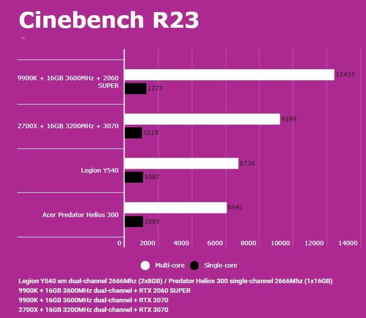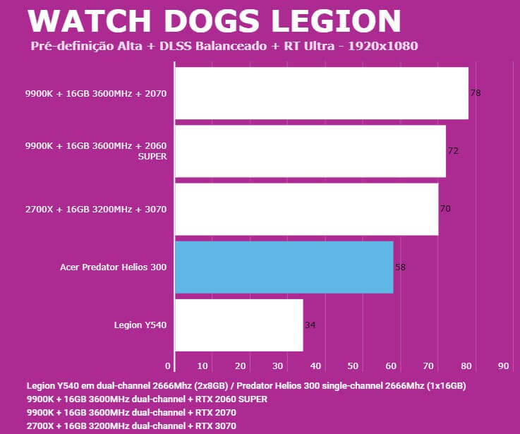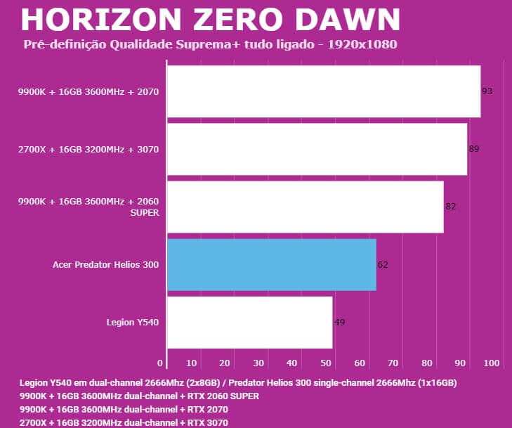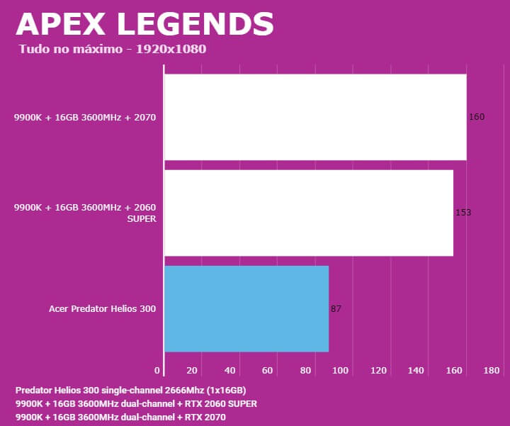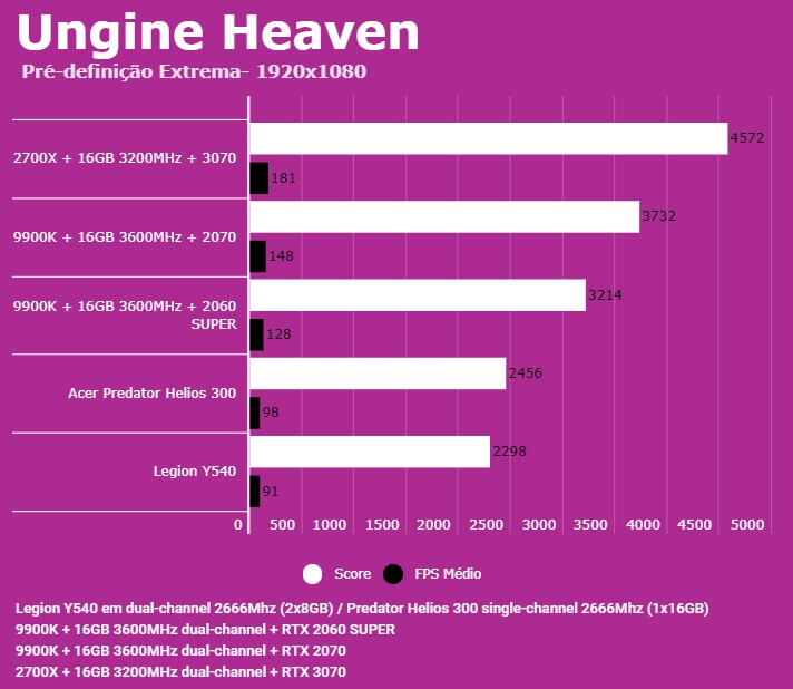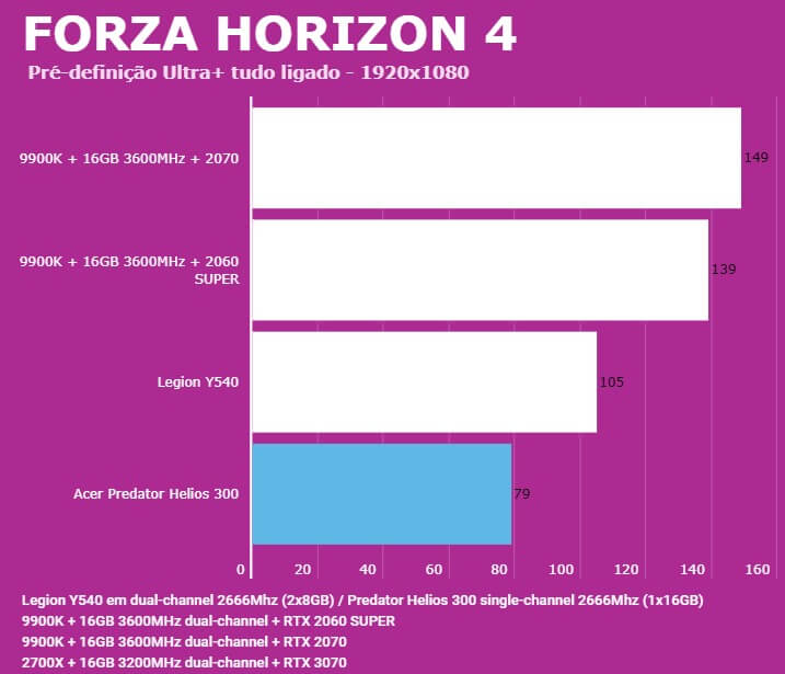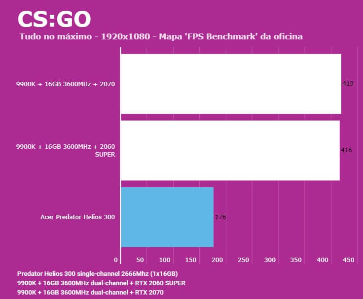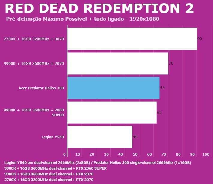 Abaixo você conseguirá comparar o desempenho do Predator Helios 300 (PH315-52-7210) com outras configurações, dentre elas o Lenovo Legion (Y540-15IRH) e PC com Intel 9900K + 2060 SUPER/2070. Em todos os testes o Helios 300 estava com o modo Turbo dos coolers ativados para evitar ao máximo o thremal throttling.