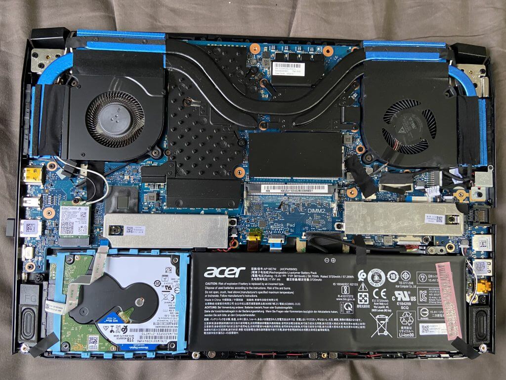 O modelo ainda conta com larga possibilidade de upgrade, contando com dois slots M.2, um SATA3 e 2 slots de RAM. Um grande vacilo da Acer é mandar este modelo com 16GB em single-channel, ou seja, 16GB em um único pente instalado. Deu para ver a diferença de desempenho na parte de processamento frente ao Lenovo Legion, que possui sistema de refrigeração inferior, só pelo simples fato de um estar em dual e outro em single-channel.
