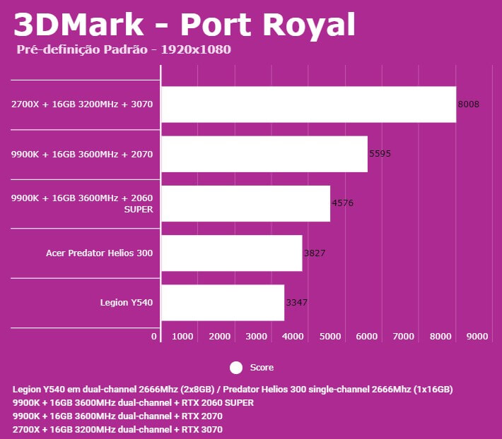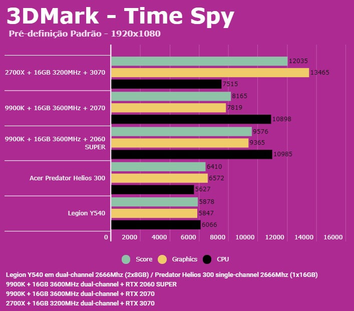 Abaixo você conseguirá comparar o desempenho do Predator Helios 300 (PH315-52-7210) com outras configurações, dentre elas o Lenovo Legion (Y540-15IRH), PC com Intel 9900K + 2060 SUPER/2070 e AMD 2700X + 3070. Em todos os testes o Helios 300 estava com o modo Turbo dos coolers ativados para evitar ao máximo o thremal throttling. Estamos investigando os resultados da 3070, para ver se os resultados foram gargalados pelo 2700X ou por algum outro motivo.
