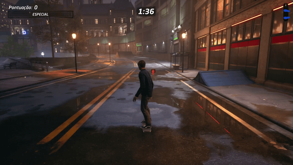 Um momento em específico que me impressionou bastante foi na fase Nova Iorque. É possível sentir a vibração dos trilhos do trem de forma absurda no controle. Isso faz com que os atropelamentos sejam um tanto quanto mais difíceis de acontecer. A única crítica que eu faria com relação ao feedback háptico é que eu senti falta da vibração do skate em alguns momentos. Seria muito interessante sentir as rodas vibrando mais forte em pisos mais ásperos ou deslizando mais fácil em pisos lisos. Talvez Astro’s Playroom nos tenha mal-acostumado com relação ao feedback do Dual Sense, mas realmente isso seria um excelente acréscimo.
