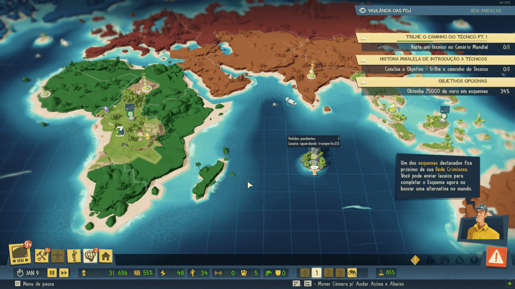 Já a segunda parte do gameplay de Evil Genius 2 envolve o mundo exterior. Como você irá querer dominar o mundo, você deverá enviar seus minions para diversas regiões no planeta. Com isso você passará a ter influência neles e poderá fazer tanto esquemas para arrecadar dinheiro como cumprir missões e avançar com a história.
