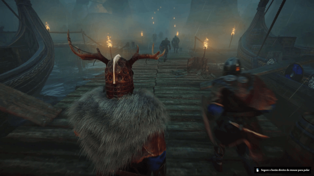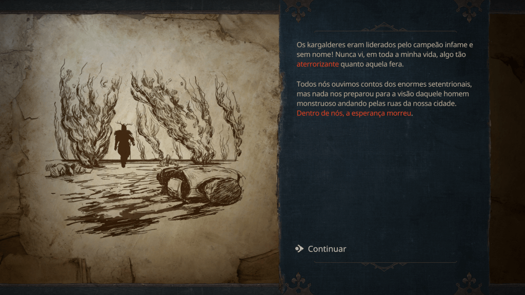 Siege Survival: Gloria Victis possui tradução para PT-BR, o que ajuda bastante no envolvimento com os personagens e na história. Esta se passa no Reino da Terra Média e começa com o cerco da sua cidade pelos guerreiros selvagens de Kargald, não encontrei referência ao local ou nome da cidade, mas com uma rápida busca, não achei um local chamado Kargald, então conclui que a ideia é termos reinos fictícios, o que é bom, pois dá a liberdade para os desenvolvedores sem correr o risco de não ser fiel ao original.