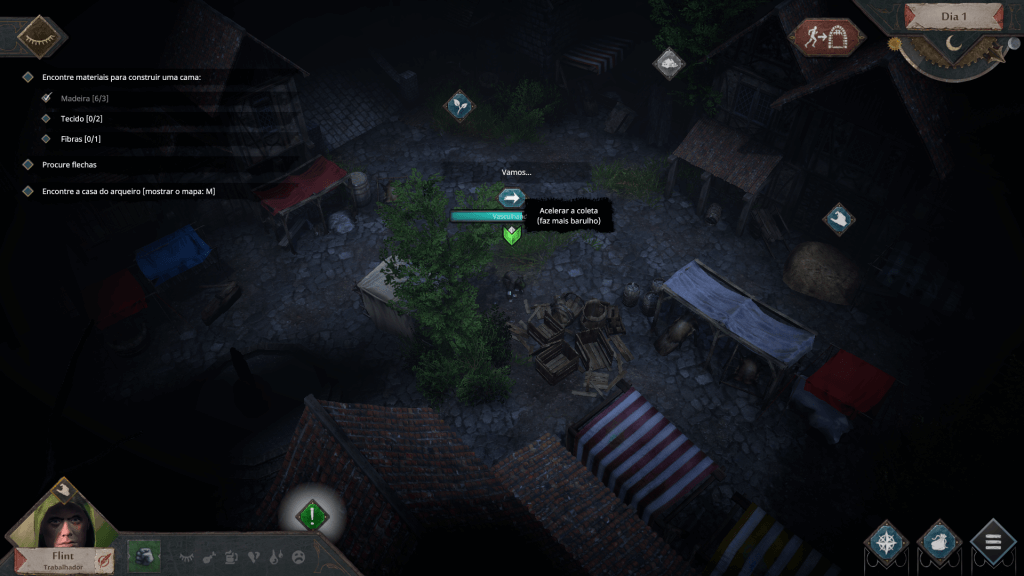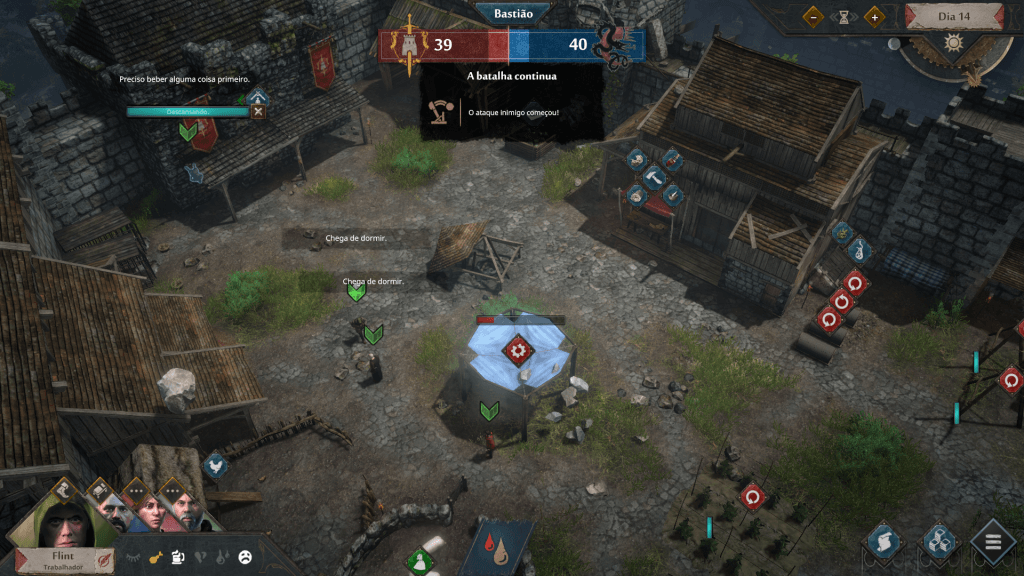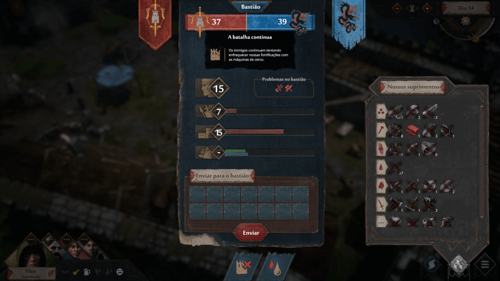 Após isso, começamos o jogo com Flint e podemos ver em sua ficha um pequeno background e sua função. Isso influencia em suas habilidades que, no caso, ele é capaz de trabalhar mais rápido que outros personagens. Com o desenrolar da história, descobrimos que não temos apenas que explorar para sobreviver, mas sim para ajudar o castelo a se manter contra os ataques. Para isso precisamos coletar recursos, consertar armas e armaduras, enviar comida, água, pedra e outros recursos que ajudam na moral e no estado dos soldados.