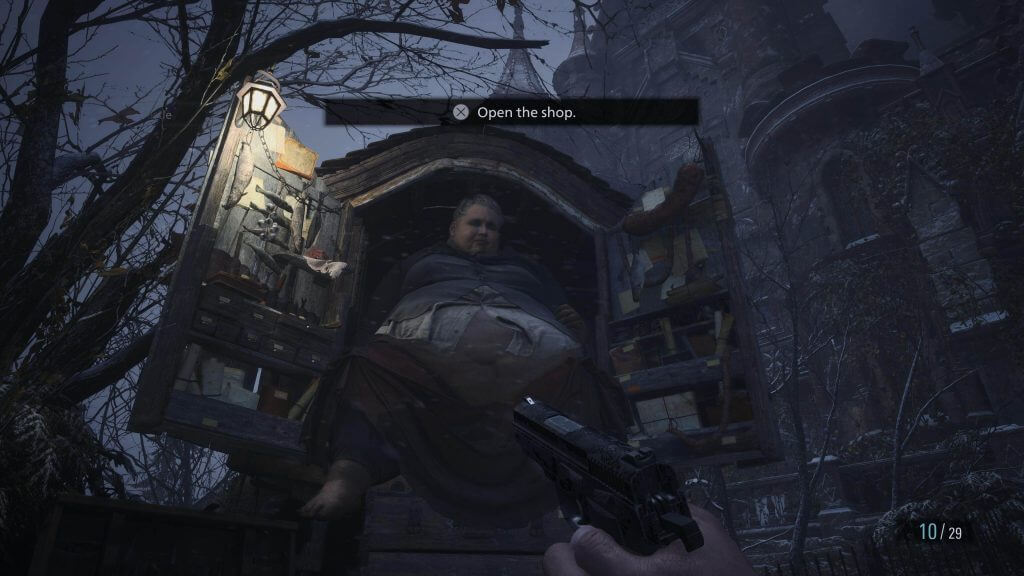 As armas são variadas e você poderá aprimorá-las, como vimos na demo, aumentando seu poder de fogo, cadência de tiro, quantidade de balas engatilhadas, etc. Pra isso você usa dinheiro (Lei), que podem ser adquiridos durante seu gameplay (seja eliminando inimigos ou achando pelo mapa), vendendo objetos valiosos e itens de uso comum. Dinheiro é essencial em Resident Evil Village e você deve usá-lo com cuidado – principalmente nas dificuldades mais altas.
