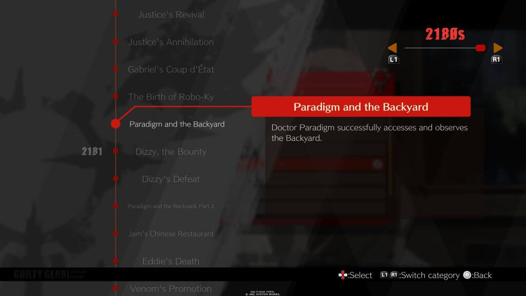 Para os novatos de primeira viagem, Guilty Gear Strive tem opções de ver um resumo da história numa linha do tempo que explica muito bem os acontecimentos mais relevantes no decorrer dos jogos anteriores da série. Junto disso, também podemos constantemente consultar informações sobre personagens e glossários em meio da campanha.