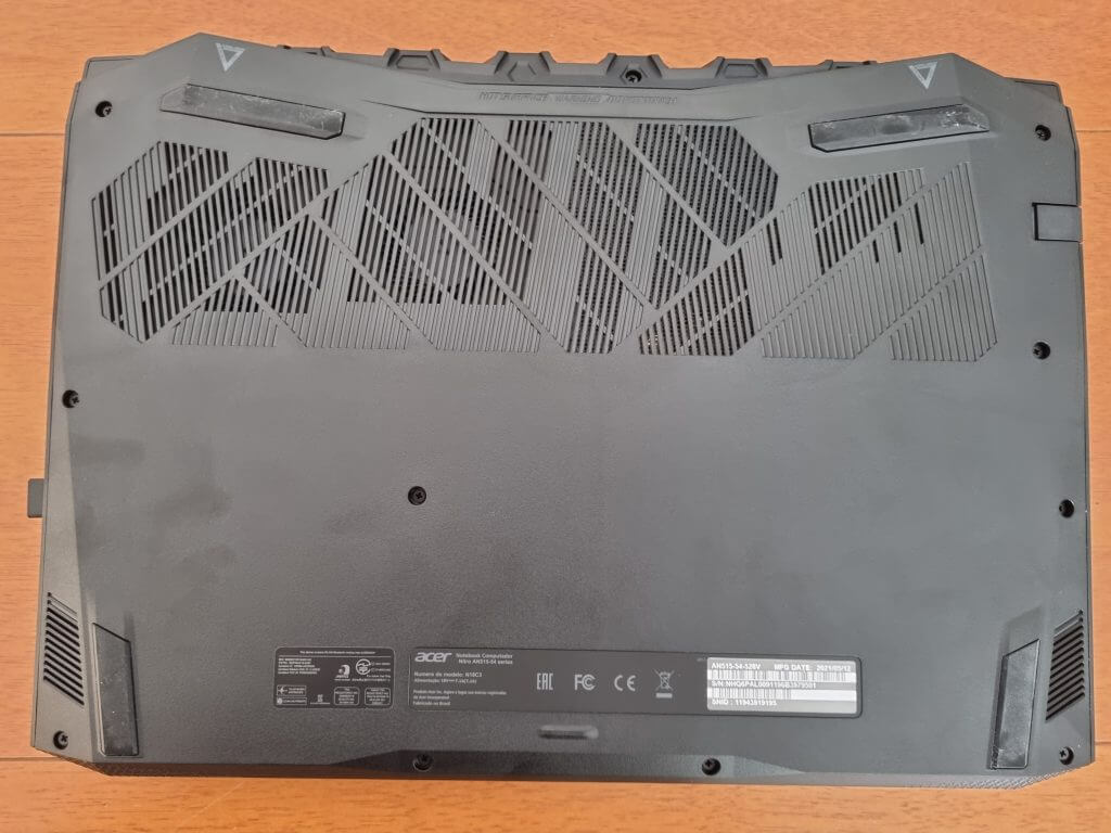 A parte inferior também é toda em plástica, sendo muito semelhante ao Helios 300. A tampa inferior é toda removível e da acesso à componentes do notebook, te facilitando bastante a vida ao trocar algum componente ou fazer upgrades. A tampa é vazada, permitindo maior fluxo de ar para manter as temperaturas sob controle.