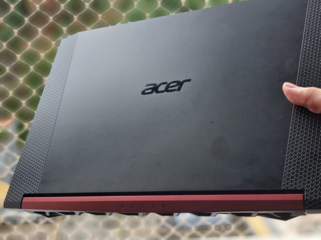 Diferente do Predator Helios 300, o Acer Nitro em questão é todo construído em uma carcaça de plástico, seja externa ou internamente. Mas isso não é ruim. O plástico possuí bom acabamento, construção sólida sem rebarbas, uma mistura de textura e parte lista em sua tampa externa e acabamento interno numa espécie de preto fosco/metalizado, que é bonito mas deixa marcada a gordura de seus dedos.