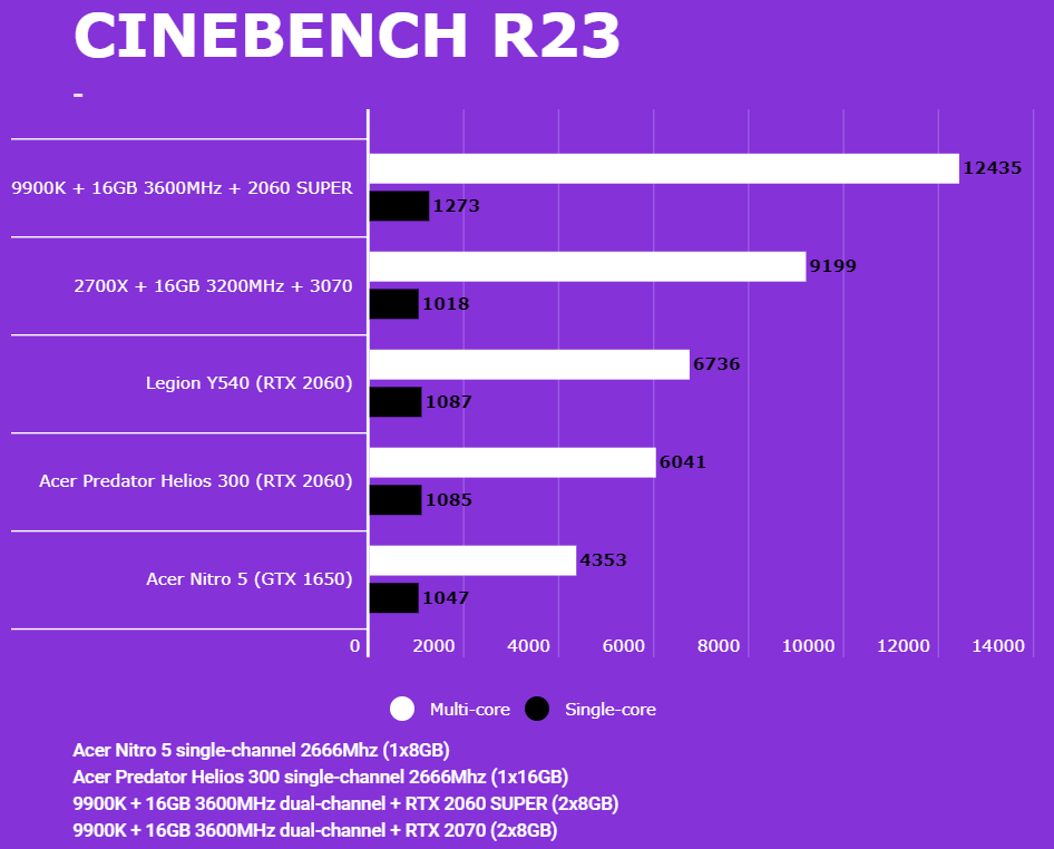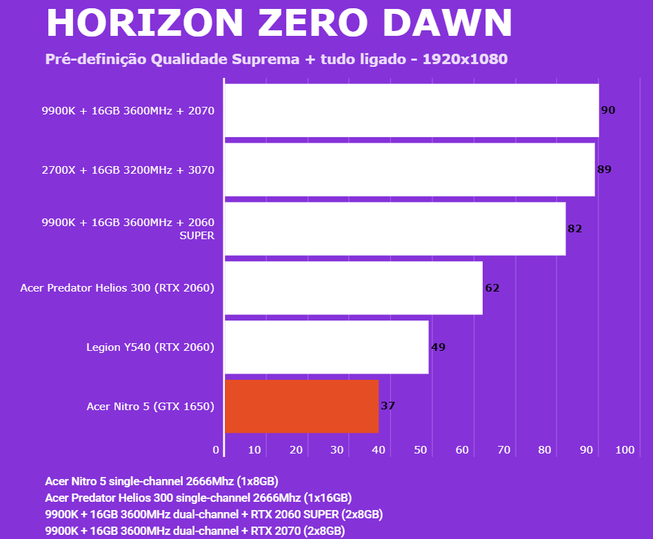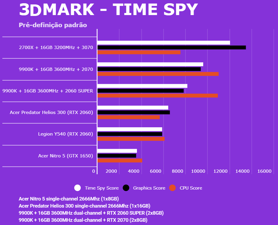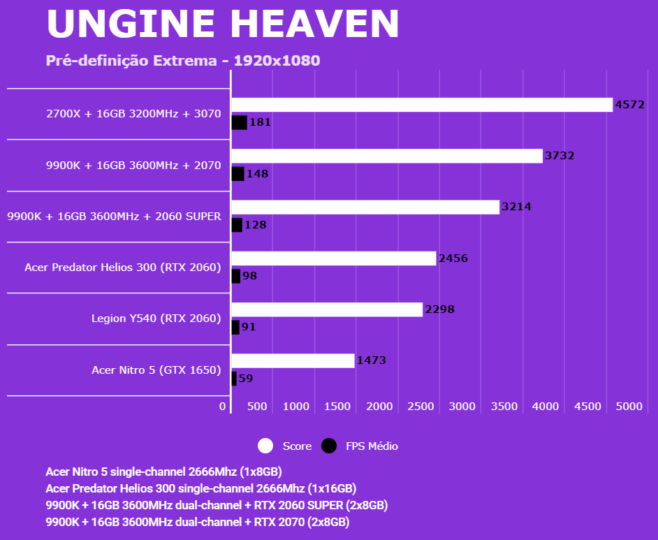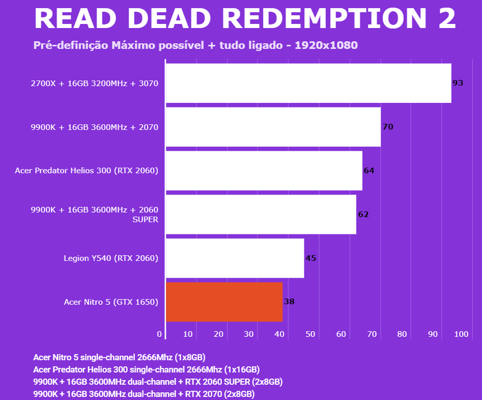 Abaixo você conseguirá comparar o desempenho do Acer Nitro 5 (AN515-54-528V) com outras configurações, dentre elas o Lenovo Legion (Y540-15IRH RTX 2060), PC com Intel 9900K + 2060 SUPER/2070, AMD 2700X + 3070 e o Predator Helios 300 (RTX 2060). Em todos os testes o Helios 300 estava com o modo Turbo dos coolers ativados para evitar ao máximo o thremal throttling. Estamos investigando os resultados da 3070, para ver se foram gargalados pelo 2700X ou por algum outro motivo.