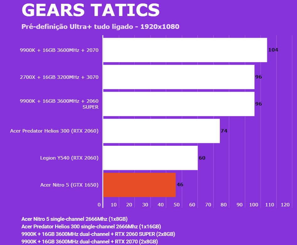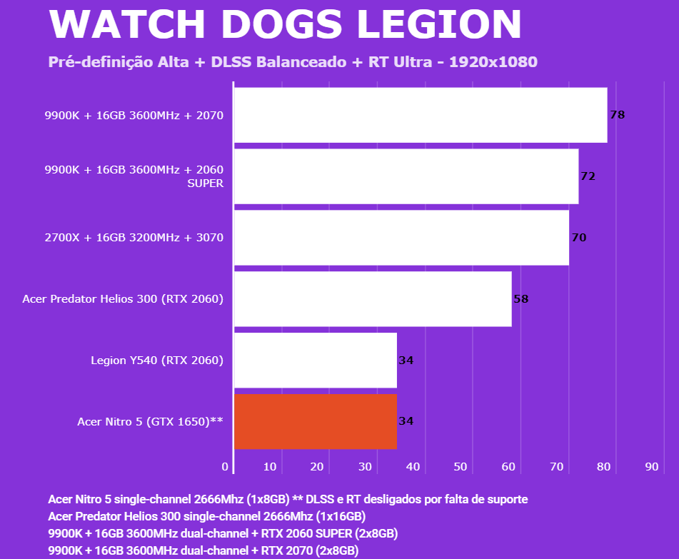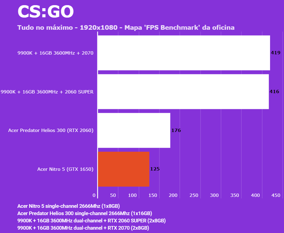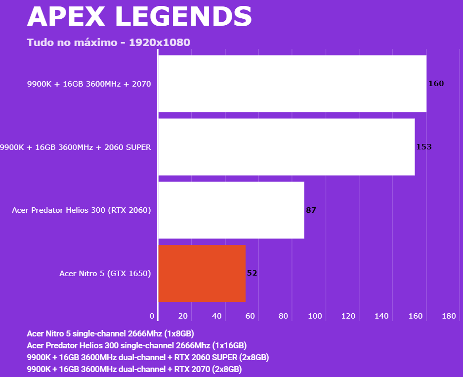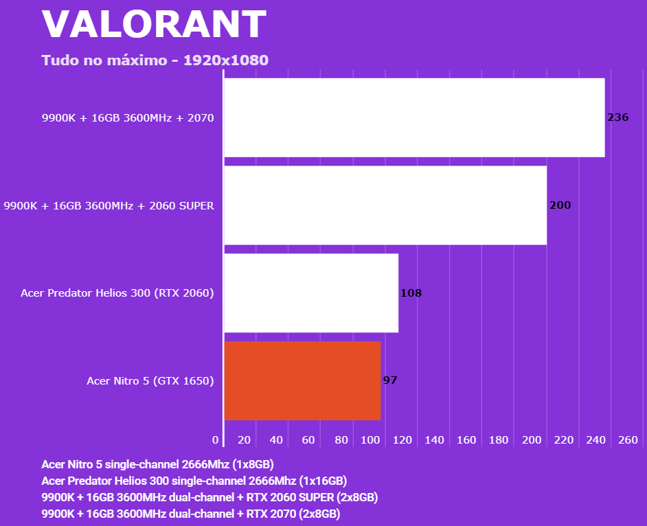 Abaixo você conseguirá comparar o desempenho do Acer Nitro 5 (AN515-54-528V) com outras configurações, dentre elas o Lenovo Legion (Y540-15IRH RTX 2060), PC com Intel 9900K + 2060 SUPER/2070 e o Predator Helios 300 (RTX 2060). Em todos os testes o Helios 300 estava com o modo Turbo dos coolers ativados para evitar ao máximo o thremal throttling. Foram jogadas partidas e medida a média dos quadro por segundo via MSI Afterburn.