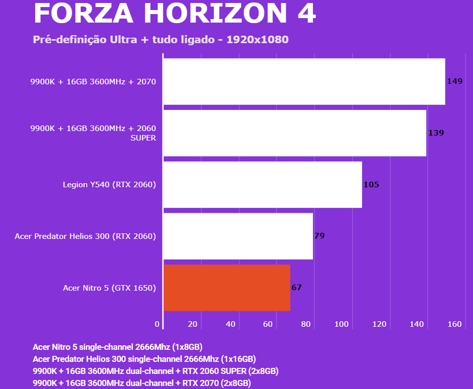 Depois te destrinchar o desempenho do Acer Predator Helios 300 (modelo com RTX 2060), desta vez temos um modelo bem mais em conta e com configurações mais modestas, focada no custo x benefício, no fps por real gasto. O Acer Nitro 5 sendo analisado vem com um processador quad-core com 8 threads, uma GTX 1650, 8GB de RAM expansíveis e armazenamento composto por um M.2 SATA3 e HD mecânico.