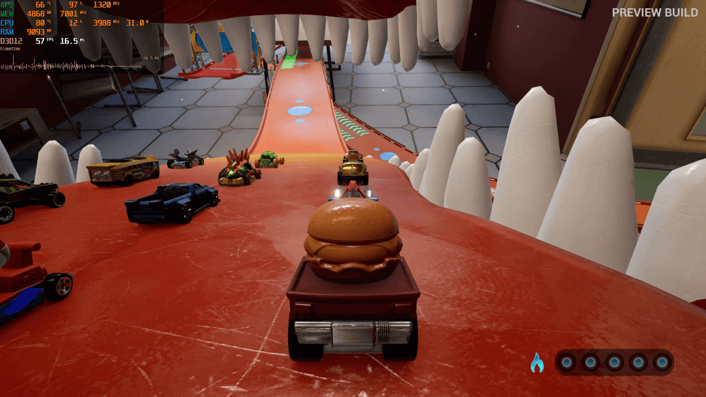 O gameplay do jogo é bem simples. Basicamente é possível acelerar, frear e usar o nitro que aumenta a velocidade do carro por um breve momento. Entretanto, as diferentes características de cada carro fazem com que as experiências de pilotar um carro de Fórmula 1 e um caminhão de lixo sejam completamente discrepantes. Os dois possuem pontos fortes e fracos com relação à aceleração, dirigibilidade, manuseio e freio, o que faz com que as corridas sejam bem balanceadas. Agora, pegar o jeito de cada um é o desafio. Isso é natural de qualquer jogo de corrida, mas Hot Wheels Unleashed tem essas características mais marcantes entre os diferentes tipos de carro, e isso faz com que a experiência seja bem variada. De forma alguma isso é algo ruim no jogo, e eu me senti incentivado a testar diferentes carros durante o gameplay.