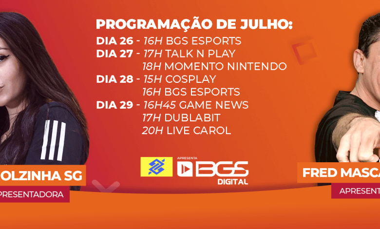 A última semana de julho será repleta de atrações virtuais nos canais oficiais da Brasil Game Show no YouTube,Twitch,Facebook e TikTok. A começar pela transmissão das partidas do campeonato de Brawl Stars, da Monster Energy BGS Esports, a partir das 16h da segunda-feira, 26. No dia seguinte, a programação começa às 17h, com a influenciadora CarolzinhaSG entrevistando a streamer Pan Shibuya no Talk N’ Play, e segue com o Momento Nintendo, às 18h, mostrando as novidades da gigante japonesa dos videogames e o gameplay do jogo The Legend of Zelda: Skyward Sword.