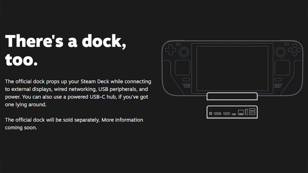 A empresa afirma que escolheu priorizar o aparelho como seu design final e seria realmente melhor não modificar ele com base no status em modo Dock ou Móvel, ela também confirma que qualquer USB-C hub poderá ser conectado no console, sendo possível conectar o Steam Deck em qualquer periférico terceiro que permita conectar aparelhos a uma tela