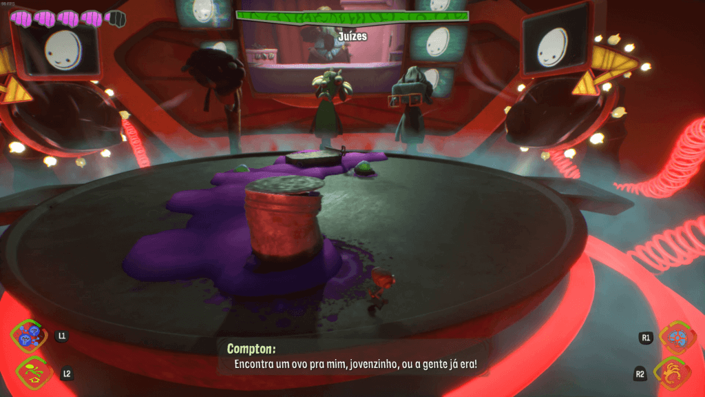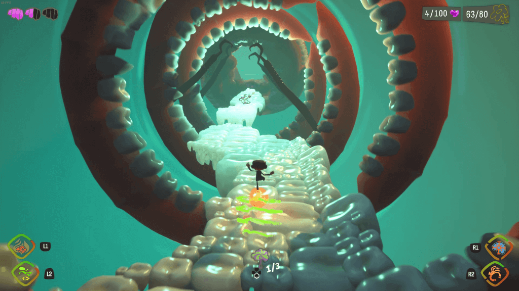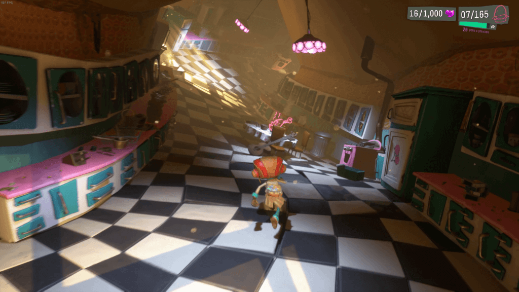 Há 8 habilidades, que podem ser melhoradas conforme Razputin vai subindo de level, e permitem fazer combos diversos durantes combates. É possível equipar 4 poderes de uma vez, que podem ser controlados rapidamente através dos botões superiores do controle. Há também uma roda de poderes que pode ser acessada segurando o direcional para cima caso você precise trocar uma habilidade em algum momento específico. Os poderes de Razputin auxiliam também durante puzzles, minigames e desafios de plataforma, que variam drasticamente dependendo de cada mente. Como eu mencionei antes, os cenários variam bastante baseados nas memórias das pessoas, tanto em temática, quanto em termos de inimigos e desafios, e cada nova invasão é uma surpresa. Há níveis em pistas de boliche gigantes, hospitais disfarçados de cassino, bibliotecas, tufos de cabelo, livros e muitos outros lugares. Criatividade é o ponto forte de Psychonauts 2, e é praticamente impossível saber o que virá pela frente.